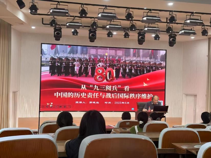 9月25日,福建江夏学院9728太阳集团首任院长郭健彪教授到我校东门梯教二楼报告厅为我院师生作“从九三阅兵看中国的历史责任与战后国际秩序维护”专题讲座,院党委副书记邓战军主持。(通讯员 周榆幸)